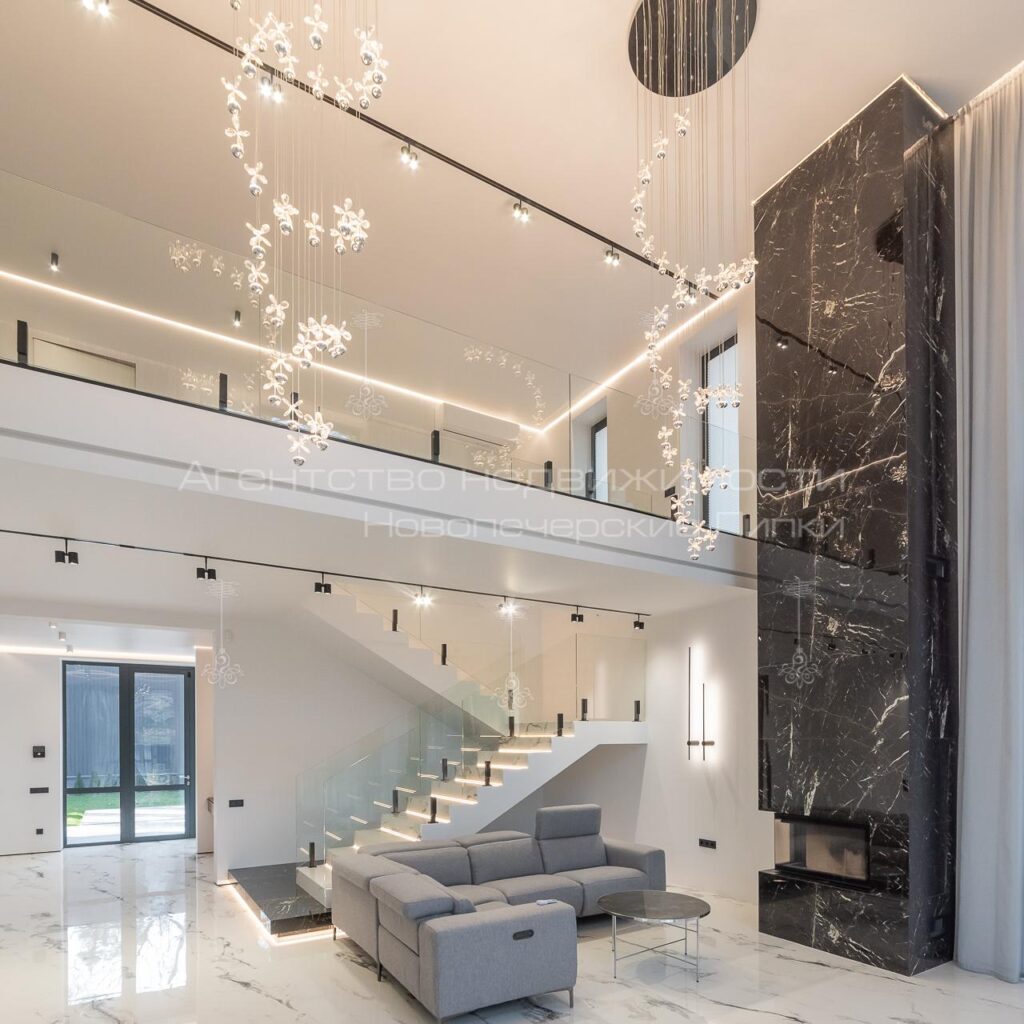 -Living room with fireplace and double-height ceilings