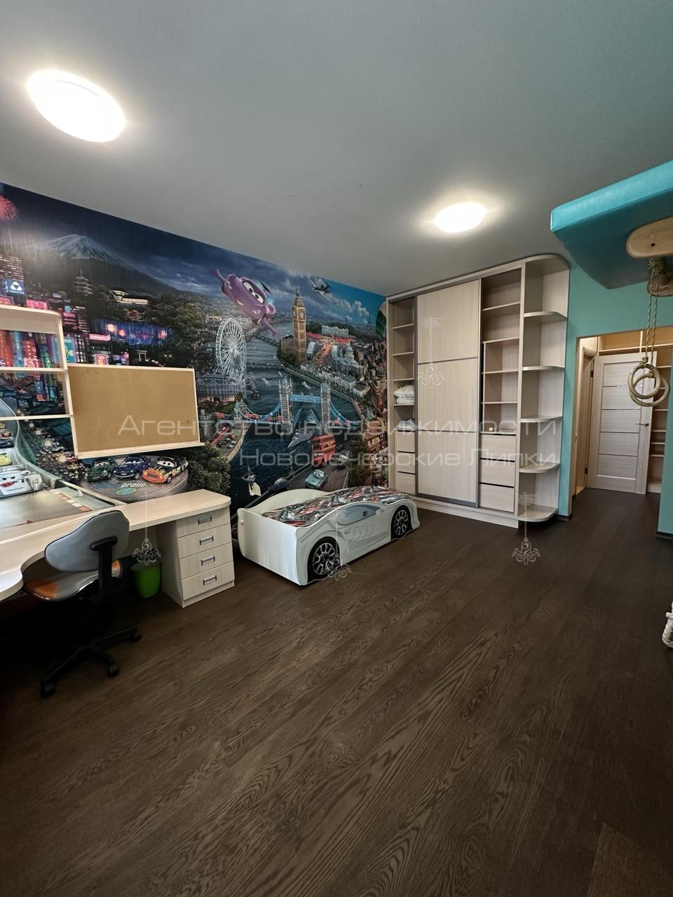 Планировка: кухня-студио, спальная комната, детская, гардеробная, ванная комната и застекленный балкон.